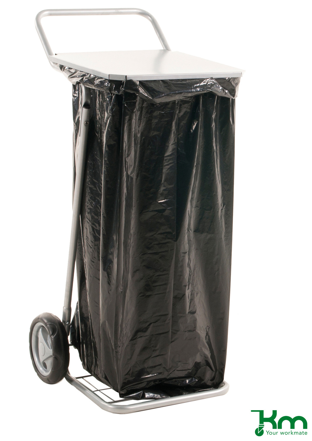 KM afvalzakwagen in gepoedercoate uitvoering, kleur grijs. De afvalzakwagen wordt geleverd met deksel en 2 massief rubberband wielen 150mm. De afvalzakwagen is geschikt voor een 125 L plastic zak en heeft een draagvermogen van 150 kg. Levering afvalzakhouder ongemonteerd.
