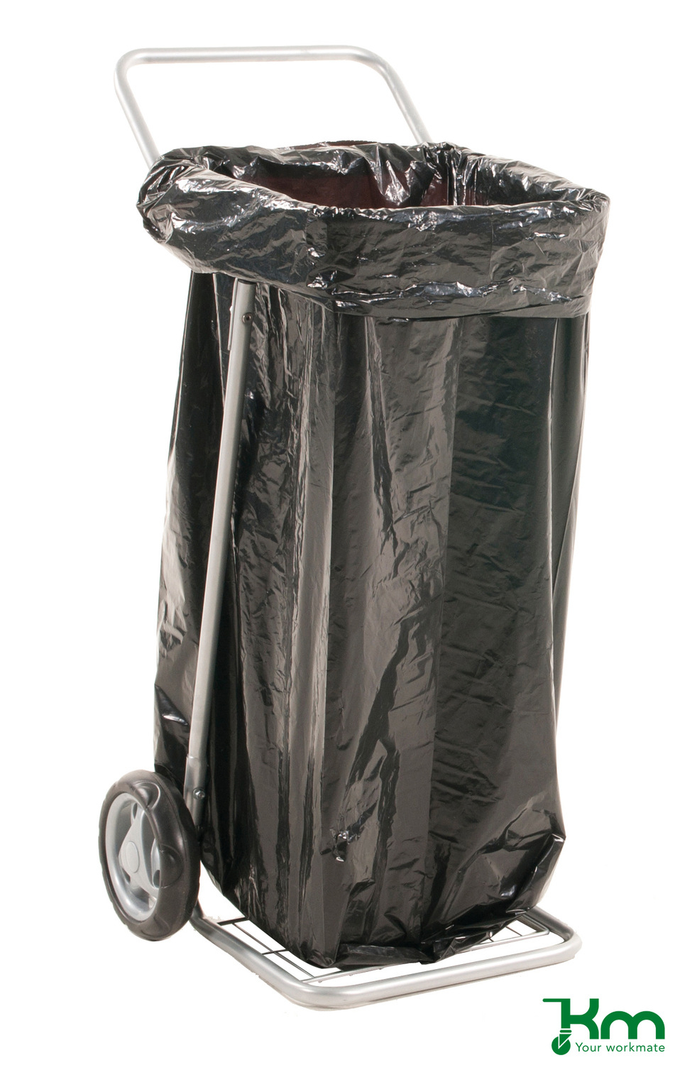 KM afvalzakwagen in gepoedercoate uitvoering, kleur grijs. De afvalzakwagen wordt geleverd met 2 massief rubberband wielen 150mm. De afvalzakwagen is geschikt voor een 125 L plastic zak en heeft een draagvermogen van 150 kg. Levering afvalzakhouder ongemonteerd.