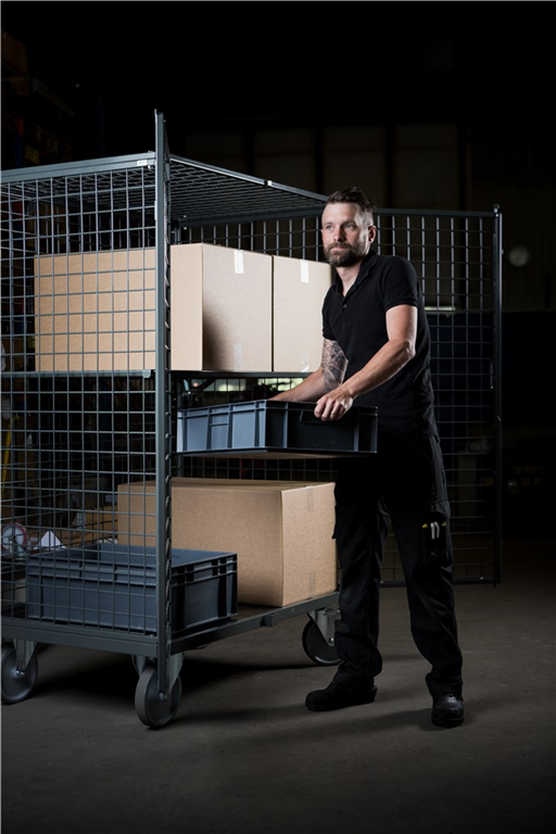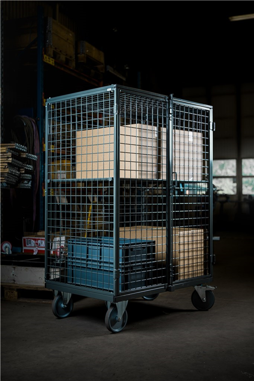 KM anti-diefstal transportwagen. De transportwagen is rondom gesloten middels gaas. Afmeting inwendig: 1160x760x1440mm (LxBxH). Levering exclusief legborden. De legborden kunnen optioneel worden bijbesteld. De afsluitbare vleugeldeuren zijn uitgevoerd met een hangslotvoorziening (levering exclusief hangslot). De transportwagen is uitgevoerd met grijze streeploze TPR zwenk- en bokwielen ®200mm (de zwenkwielen zijn uitgevoerd met een rem). Afwerking transportwagen: poedercoating grijs ral 7043. Levering ongemonteerd.