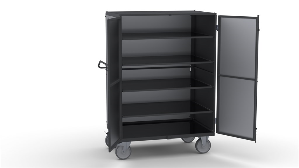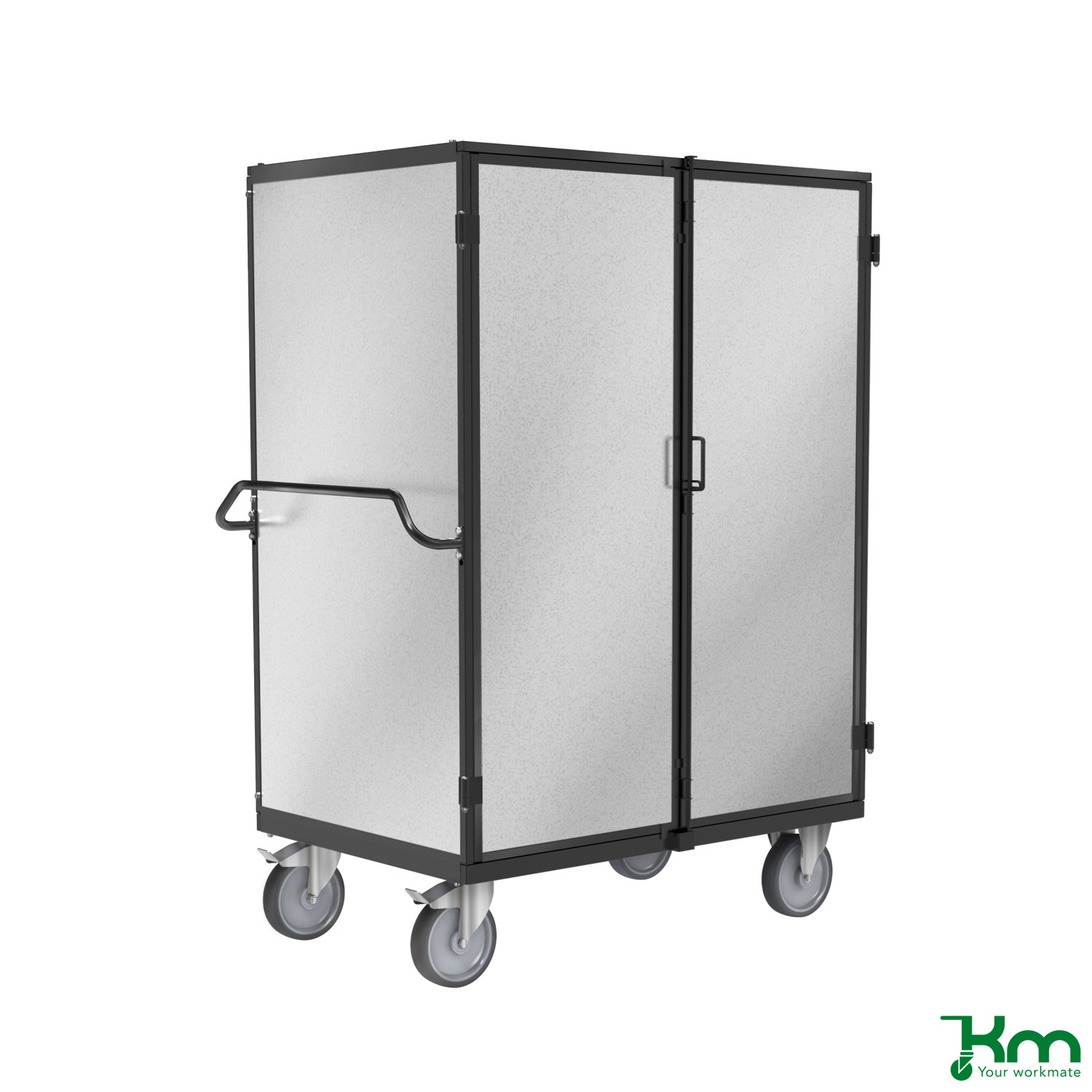 KM anti-diefstal transportwagen. De transportwagen is rondom gesloten middels staalplaat. Afmeting inwendig: 1160x760x1440mm (LxBxH). Levering exclusief legborden. De legborden kunnen optioneel worden bijbesteld. De afsluitbare vleugeldeuren zijn uitgevoerd met een hangslotvoorziening (levering exclusief hangslot). De transportwagen is uitgevoerd met grijze streeploze TPR zwenk- en bokwielen ®200mm (de zwenkwielen zijn uitgevoerd met een rem). Afwerking transportwagen: poedercoating grijs ral 7043. Levering ongemonteerd.