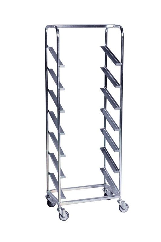 Bakkenwagen vervaardigd van elektrolytisch verzinkte buis Ø25 mm. De bakkenwagen is geschikt voor 7 kunststof bakken 600×400 mm, die onder een hoek geplaatst kunnen worden in de bakkenwagen. De Kongamek bakkenwagen is voorzien van 4 zwenkwielen, waarvan 2 geremd met een grijze rubberband.