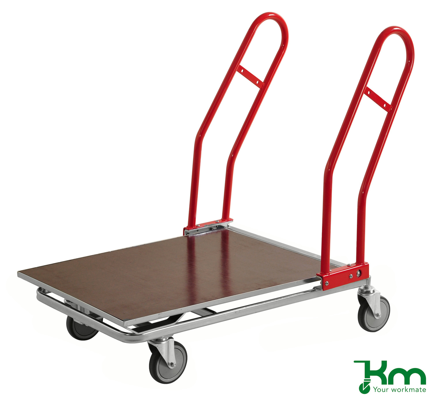 Winkelwagen of cash-and-carry wagen in elektrolytisch verzinkte uitvoering. De wagens zijn voorzien van een resistent multiplex platform met een gelamineerde toplaag en handgrepen in rode poedercoating. De wagens zijn in elkaar te schuiven, zodat plaatsbesparing wordt gecreëerd. Uitgevoerd met 4 grijze rubberband zwenkwielen zonder rem, Ø125 mm. Draagvermogen 200 kg. Levering wagens ongemonteerd.