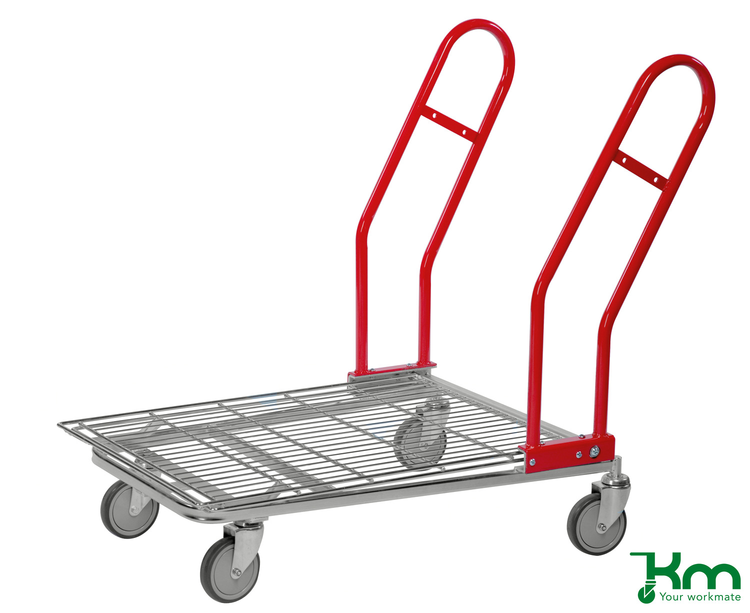 Winkelwagen of cash-and-carry wagen in elektrolytisch verzinkte uitvoering. De wagens zijn voorzien van handgrepen in rode poedercoating. De wagens zijn in elkaar te schuiven, zodat plaatsbesparing wordt gecreëerd. Uitgevoerd met 4 grijze rubberband zwenkwielen zonder rem, Ø125 mm. Draagvermogen 200 kg. Levering wagens ongemonteerd.