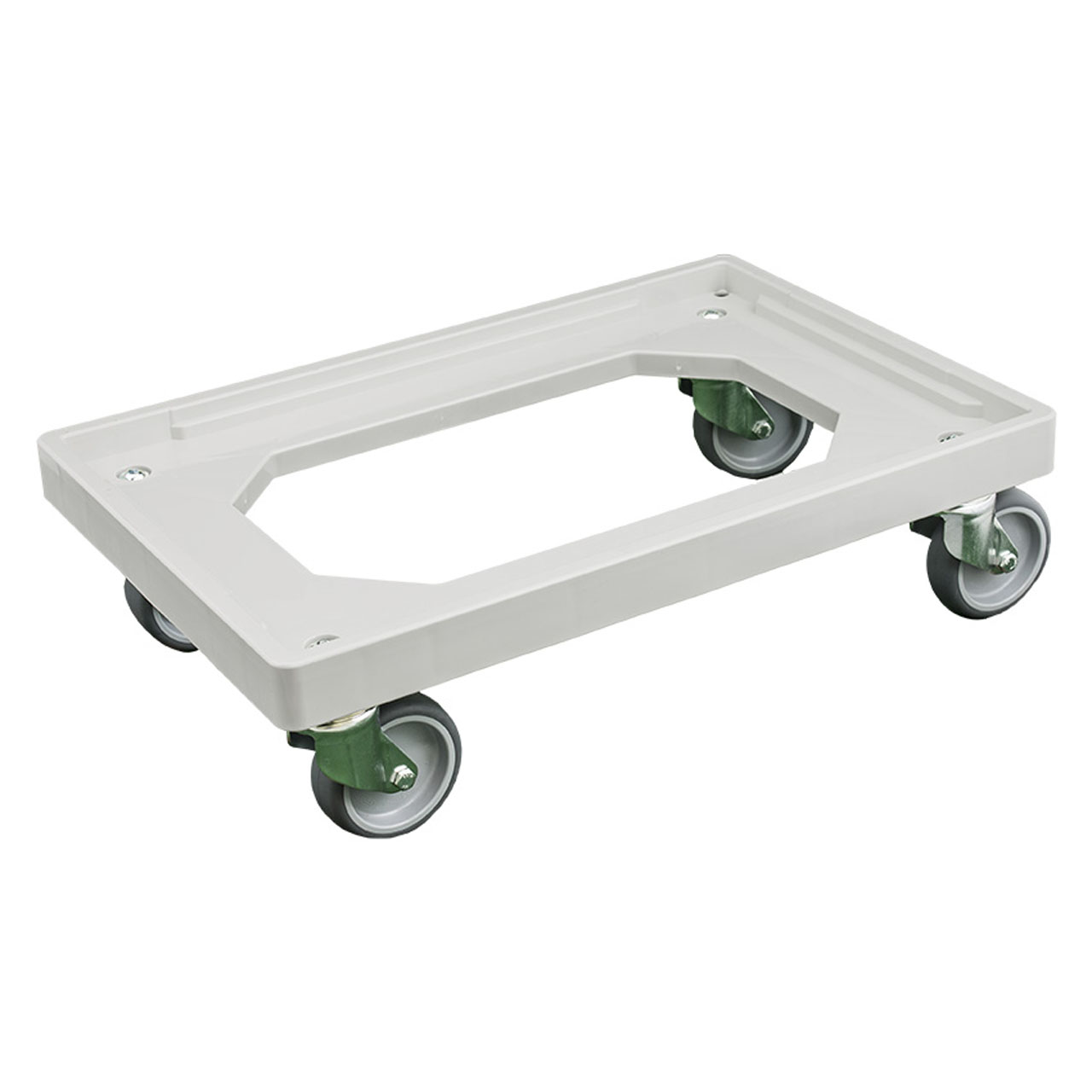 Onderstel heeft opstaande rand waardoor de bakken stabiel op het onderstal staan, ook geschikt voor nestbare bakken, voorzien van 4 PP wielen met thermoplastisch rubber loopvlak, gegalvaniseerde zwenkgaffels met dubbele kogeldraaikransen, dynamisch draagvermogen van 240 kg