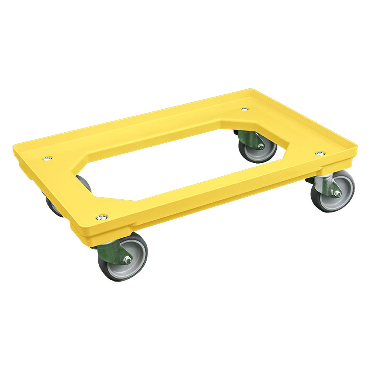 Onderstel heeft opstaande rand waardoor de bakken stabiel op het onderstal staan, voorzien van 4 PP wielen met thermoplastisch rubber loopvlak, gegalvaniseerde zwenkgaffels met dubbele kogeldraaikransen, dynamisch draagvermogen van 240 kg