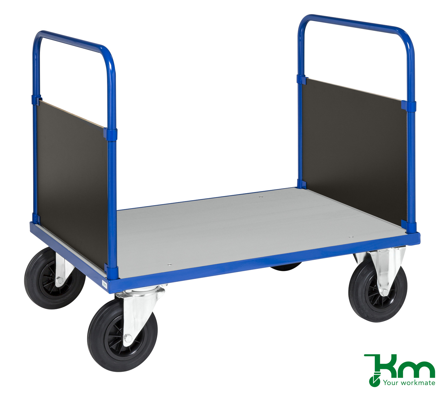 Makkelijk manouvrerende dubbele kopwandwagen. De kopwandwagen is voorzien van een poedercoating kleur blauw. Draagvermogen bedraagt 500 kg. Laadvloer van 2 mm verzinkte staalplaat. Zij- en kopwanden van gemelamineerd MDF. Uitgevoerd met 2 zwenkwielen met rem en 2 bokwielen diameter 200 mm, massief rubber. Wielenset en opbouw wordt ongemonteerd meegeleverd.