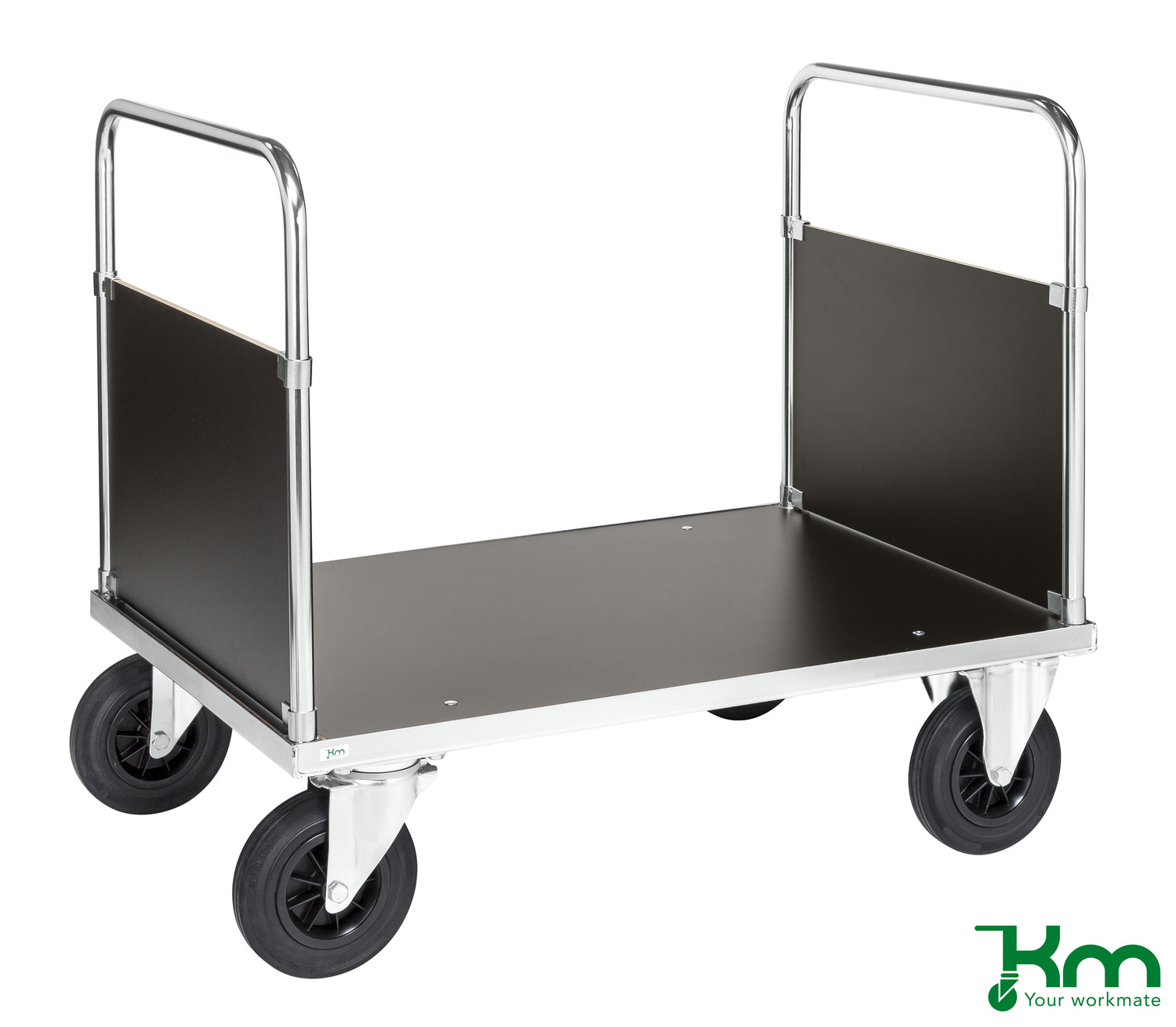 Makkelijk manouvrerende dubbele kopwandwagen. De kopwandwagen wordt geleverd in een elektrolytisch verzinkte uitvoering. Draagvermogen bedraagt 500 kg. Laadvloer van gemelamineerd MDF. Zij- en kopwanden van gemelamineerd MDF. Uitgevoerd met 2 zwenkwielen met rem en 2 bokwielen Ø200 mm, massief rubber. Wielenset en opbouw wordt ongemonteerd meegeleverd.