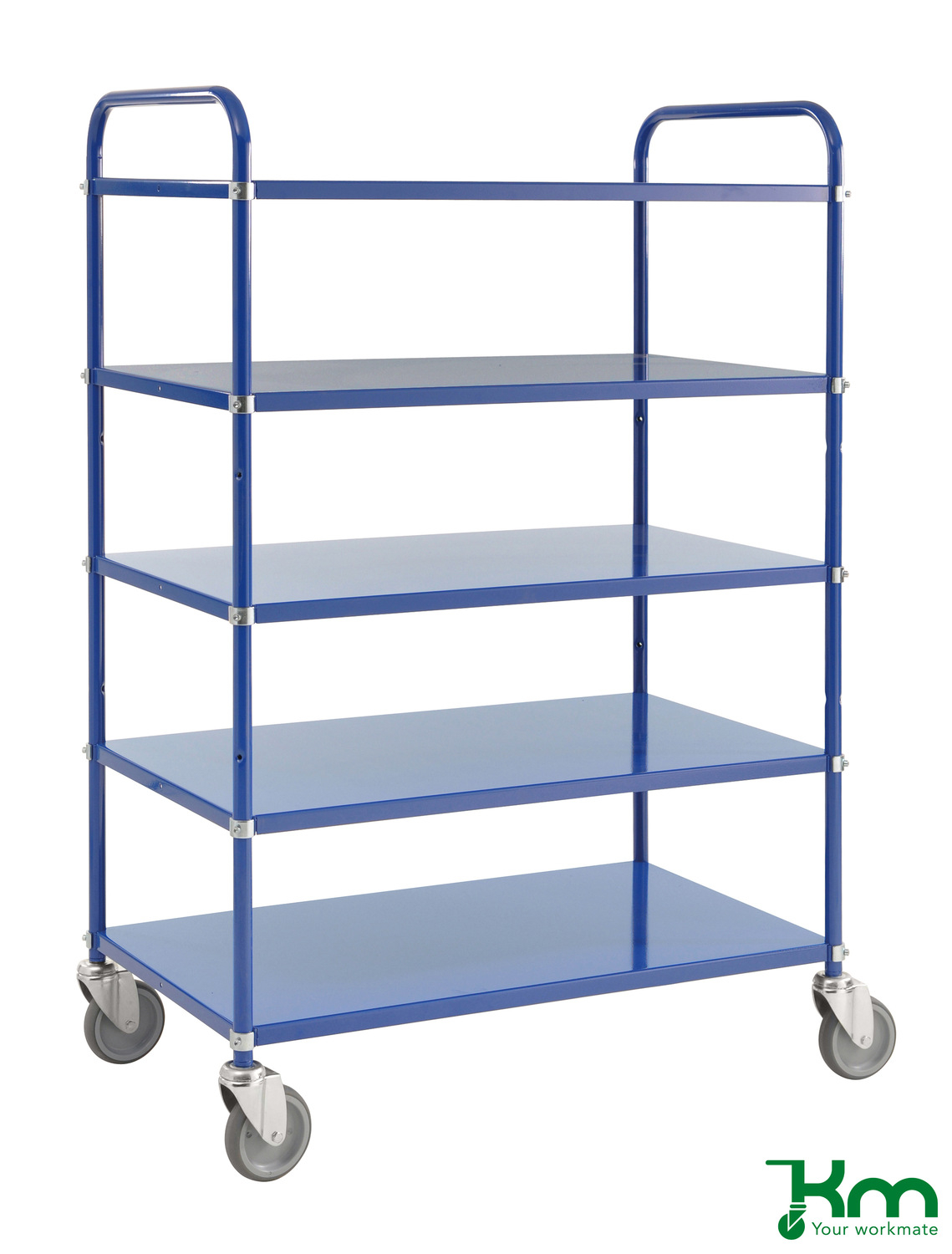 Etagewagen vervaardigd van ronde buis en plaatstaal. De etagewagens zijn leverbaar in poedercoating wit, blauw of in elektrolytisch verzinkte uitvoering. KM etagewagens worden geleverd met 5 legborden vervaardigd van plaatstaal. De legborden kunnen zowel met als zonder een opstaande rand gemonteerd worden. De etagewagens zijn uitgevoerd met 2 grijze rubberband zwenkwielen met rem en 2 grijze rubberband zwenkwielen zonder rem. Levering etagewagen ongemonteerd.