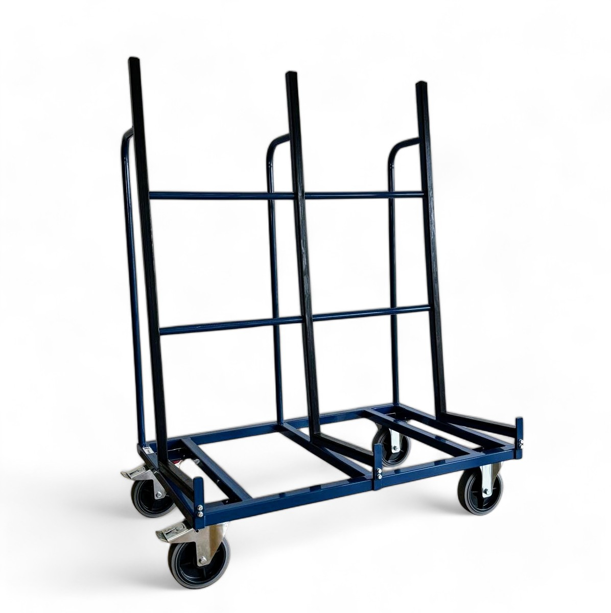 FRAMI enkelzijdige glas- en platenwagen 1300×800 mm, nuttige breedte laadvlak: 420mm. Hart op hart maat tussen de laadvlakken is 630 mm. Hoogte staanders 1450 mm. De profielen zijn bekleed met rubber. Draagvermogen 1200 kg. Uitgevoerd met 2 zwenkwielen met rem en 2 bokwielen. Wielen met grijze TPR band en kogellagers. Afwerking: poedercoating blauw ral 5001