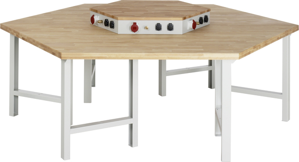 Groepswerkbank met energievoorziening en massief beuken werkblad