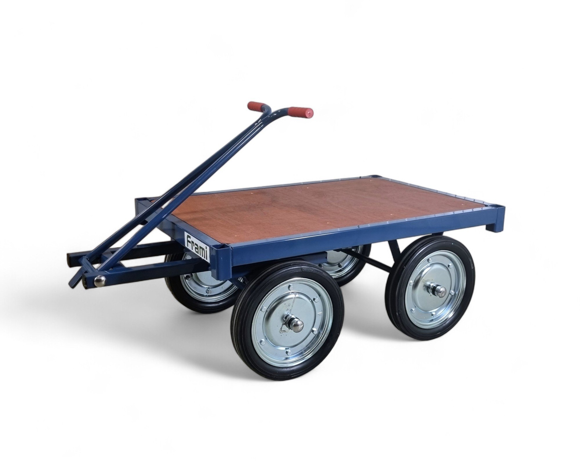 Frami handtrekwagens worden vervaardigd van robuuste buis en profielstaal. De handtrekwagens zijn voorzien van wielen met massieve rubberband. De wielen zijn uitgevoerd met rollagers. Het draaistel is uitgevoerd met een precisie kogeldraaikrans voor optimale stabiliteit. De handtrekstang is voorzien van handgrepen met kunststof handvatten. De handtrekwagens met een draagvermogen van 1000 kg worden voorzien van een meranti laadvloer. De laadvloer wordt binnen het frame gemonteerd. Frami handtrekwagens worden voorzien van een poedercoating