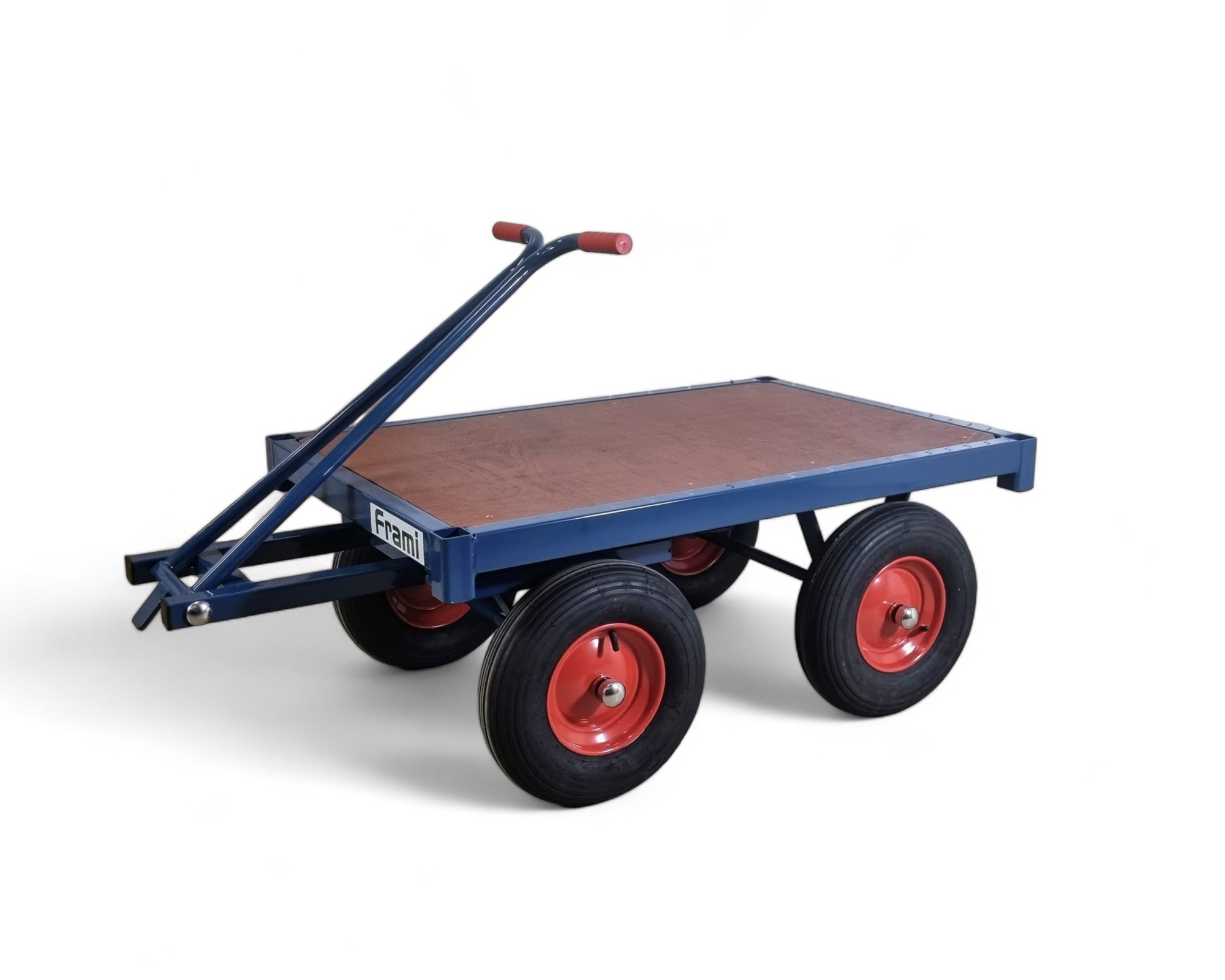 Frami handtrekwagens worden vervaardigd van robuuste buis en profielstaal. De handtrekwagens zijn voorzien van luchtbandwielen. De wielen zijn uitgevoerd met rollagers. Het draaistel is uitgevoerd met een precisie kogeldraaikrans voor optimale stabiliteit. De handtrekstang is voorzien van handgrepen met kunststof handvatten. De handtrekwagens met een draagvermogen van 1000 kg worden voorzien van een meranti laadvloer. De laadvloer wordt binnen het frame gemonteerd. Frami handtrekwagens worden voorzien van een poedercoating