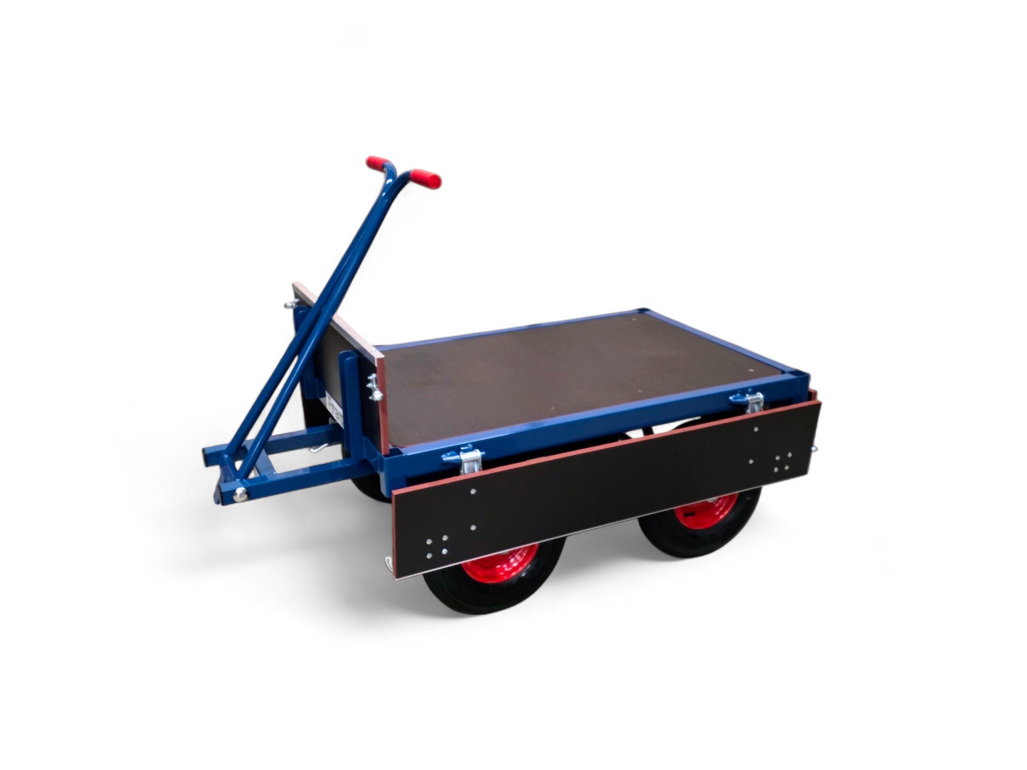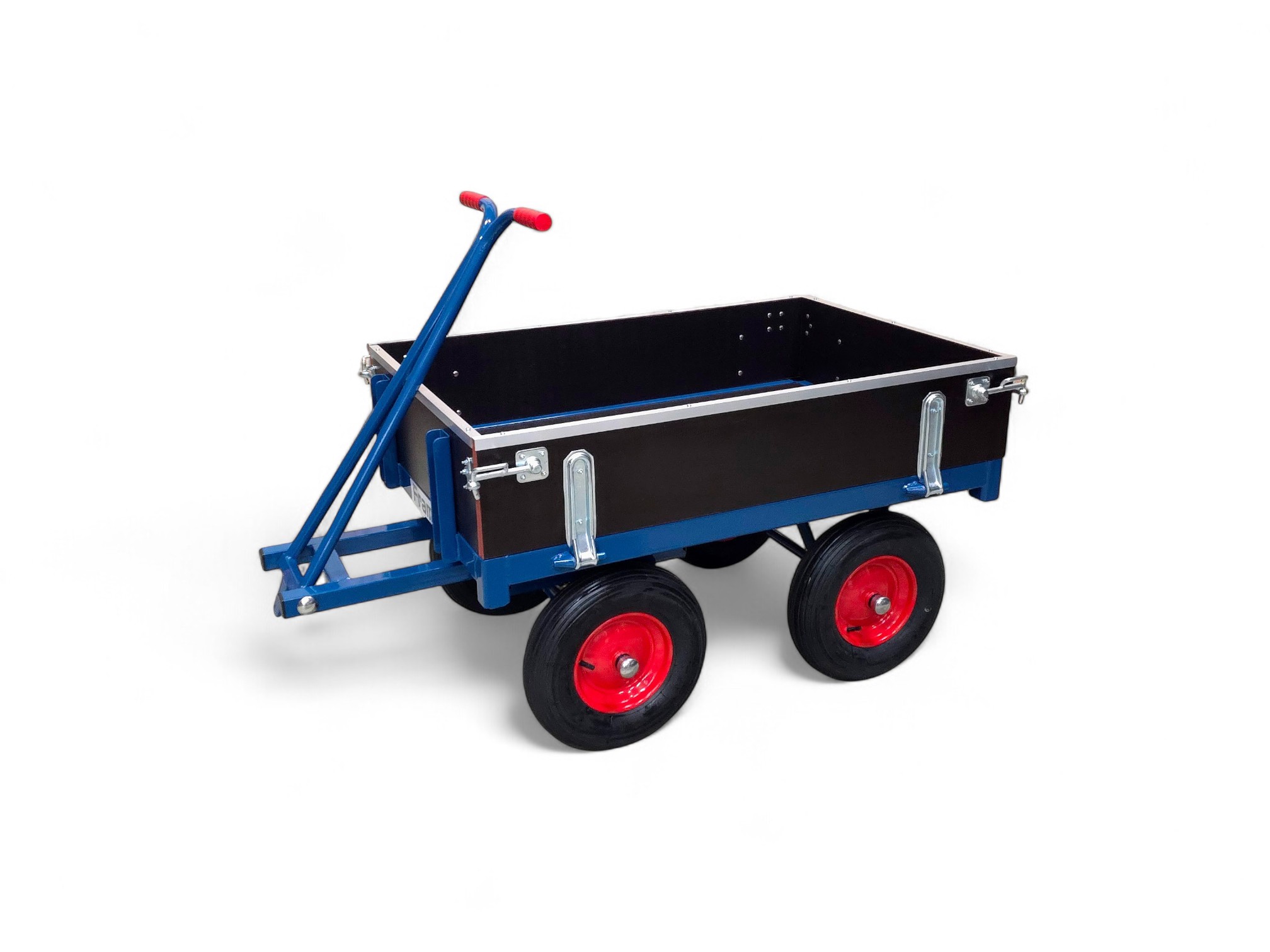 Handtrekwagen met neerklapbare zij- en achterwand en enkele draaischamelbesturing. Luchtbandwielen. Laadvlakafmeting 1200×800 mm. Draagvermogen 1000 kg.
