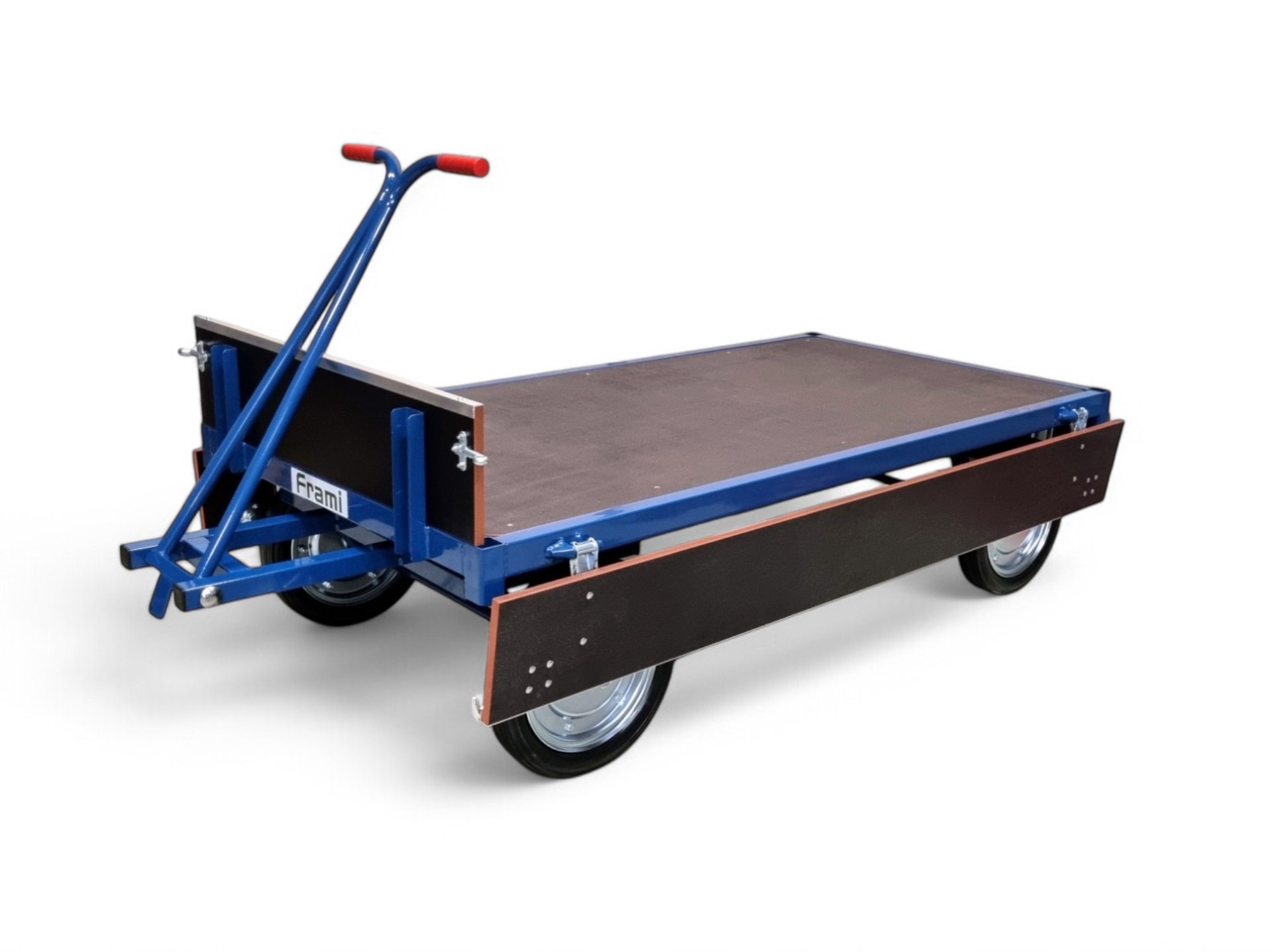 Handtrekwagen met neerklapbare zij- en achterwand en enkele draaischamelbesturing. Wielen met massieve rubberband. Laadvlakafmeting 2000×1000 mm. Draagvermogen 1000 kg.