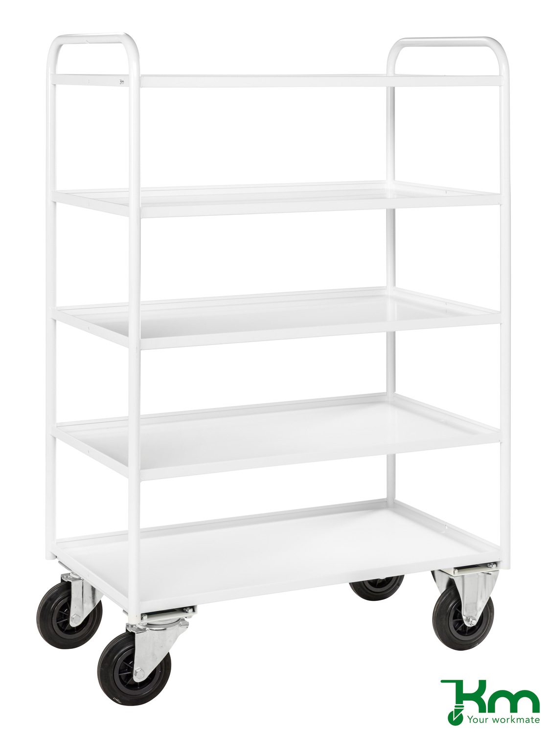 Heavy-duty etagewagen in volledig gelaste stalen constructie. De etagewagen wordt voorzien van een poedercoating. De heavy-duty etagewagen wordt geleverd met 5 legborden met opstaande rand. De nuttige tussenruimte tussen de legborden bedraagt 260 mm. Uitgevoerd met 2 zwenkwielen met rem en 2 bokwielen met zwarte massieve rubberband.