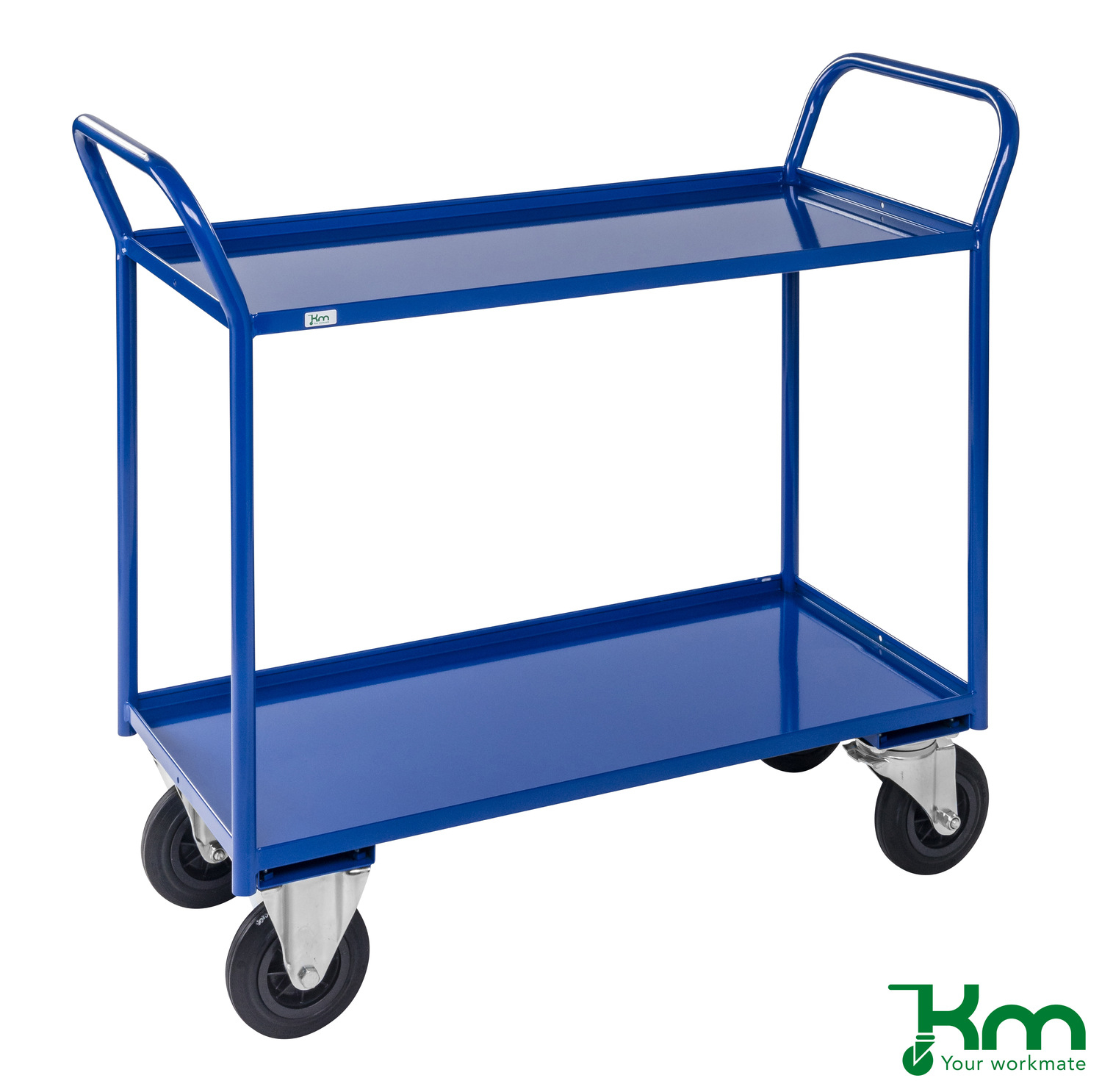 Heavy-duty tafelwagen in volledig gelaste stalen constructie. De tafelwagen wordt voorzien van een poedercoating. De heavy-duty tafelwagen wordt geleverd met 2 legborden. De nuttige tussenruimte tussen de legborden bedraagt 540 mm. Uitgevoerd met 2 zwenkwielen met rem en 2 bokwielen met zwarte massieve rubberband.