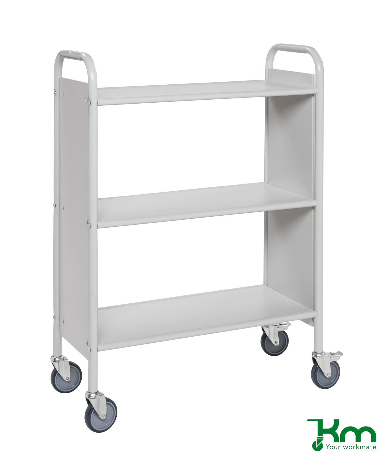 Kongamek archieftrolley 780x345x1115 (LxBxH) KM158-LG, draagvermogen 150 kg. Uitvoerd met 3 niveaus. Poedercoating lichtgrijs.