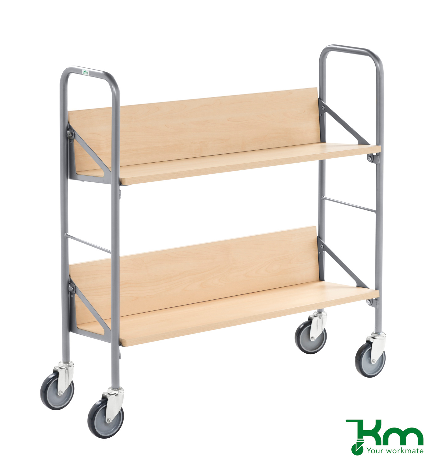 Kongamek archieftrolley 900x300x920 (LxBxH) KM156, draagvermogen 50 kg. Uitvoerd met 2 schuin aflopende schappen van berkenhout melamine. Poedercoating grijs. Levering inclusief 4 boeken/mappen steunen