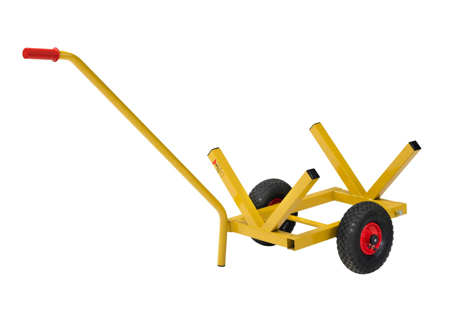Transportwagen voor het transport van lange materialen. De wagen is uitgevoerd met luchtbandwielen ø260mm. De handgreep is uitneembaar. Afwerking: poedercoating kleur geel.