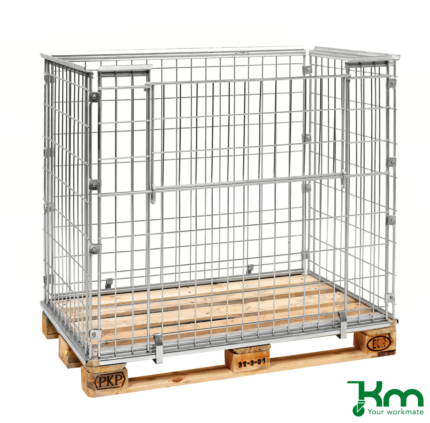 Elektrolytisch verzinkte pallet opzetframe. De pallet opzetframes kunnen worden gemonteerd op standaard europallets, EUR pallets 1200×800 mm. De pallet opzetframes zijn uitgevoerd met een half neerklapbare wand aan de lange zijde. De pallet opzetframes hebben een draagvermogen van 800 kg per stuk en kunnen 3-voudig worden gestapeld. De pallet opzetframes passen ook op alle KM transportwagens 1200×800 mm. Levering pallet opzetframe ongemonteerd.