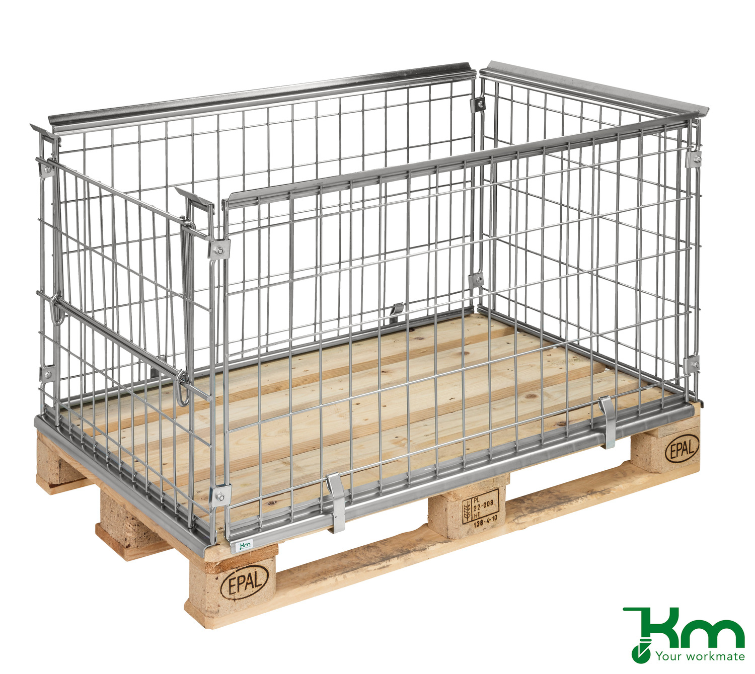 Elektrolytisch verzinkte pallet opzetframe. De pallet opzetframes kunnen worden gemonteerd op standaard europallets, EUR pallets 1200×800 mm. De pallet opzetframes zijn uitgevoerd met een half neerklapbare wand aan de korte zijde. De pallet opzetframes hebben een draagvermogen van 800 kg per stuk en kunnen 3-voudig worden gestapeld. De pallet opzetframes passen ook op alle KM transportwagens 1200×800 mm. Levering pallet opzetframe ongemonteerd.