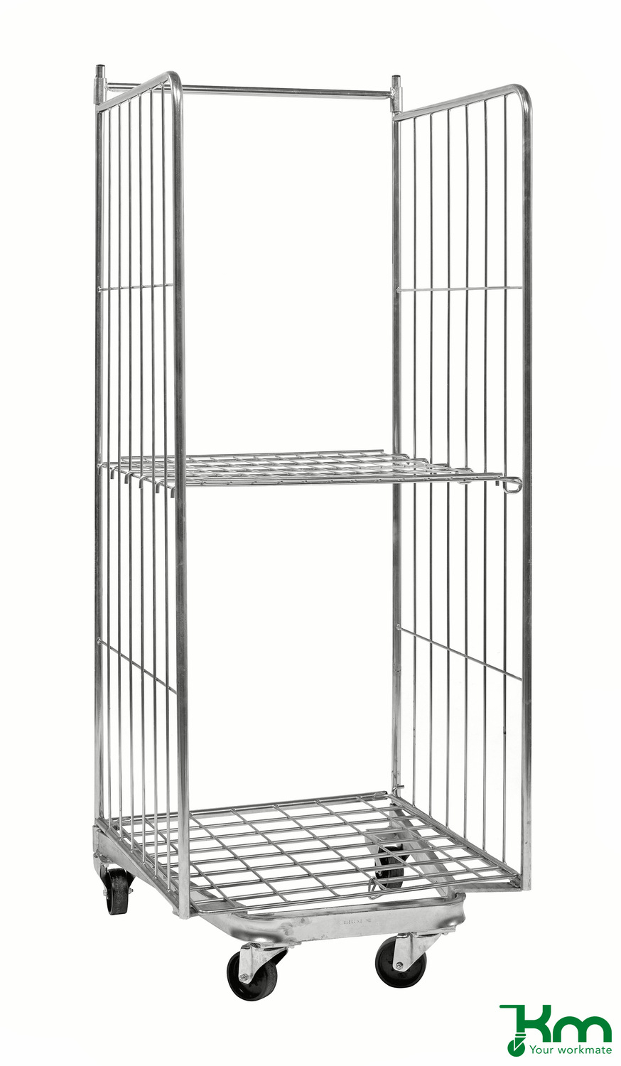 Elektrolytisch verzinkte, nestbare rolcontainer met 2 zijwanden en 1 legbord, voorzien van 2 zwenkwielen zonder rem en 2 bokwielen zonder rem. De rolcontainer is vervaardigd van ronde buis Ø21,25 mm. De nestbare rolcontainers hebben een maaswijdte van 105×395 mm. De zijwanden van de nestbare rolcontainers kunnen zonder gereedschappen worden bevestigd. De rolcontainers van KM hebben een draagvermogen van 400 kg.