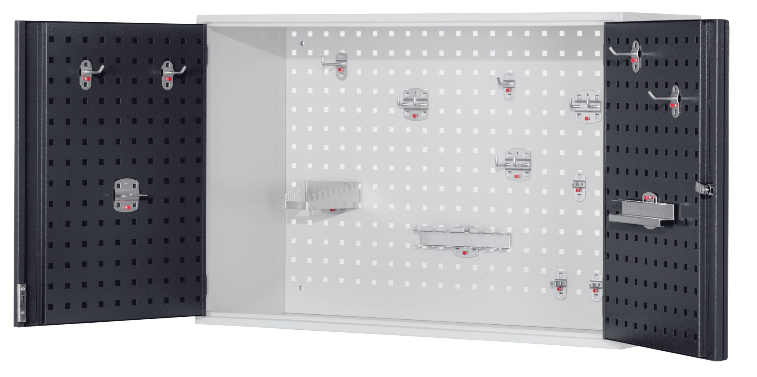 Deze stabiele en afsluitbare wandkasten zijn aan de binnenzijde voorzien van ®RasterPlan perfo-en/of sleuvenpanelen. De ®RasterPlan wandkasten bieden op deze wijze de mogelijkheid kleine gereedschapsets, eventueel samen met een onderdelen assortiment, plaats besparend en overzichtelijk op te bergen. En dat direct op of boven de werkplek.