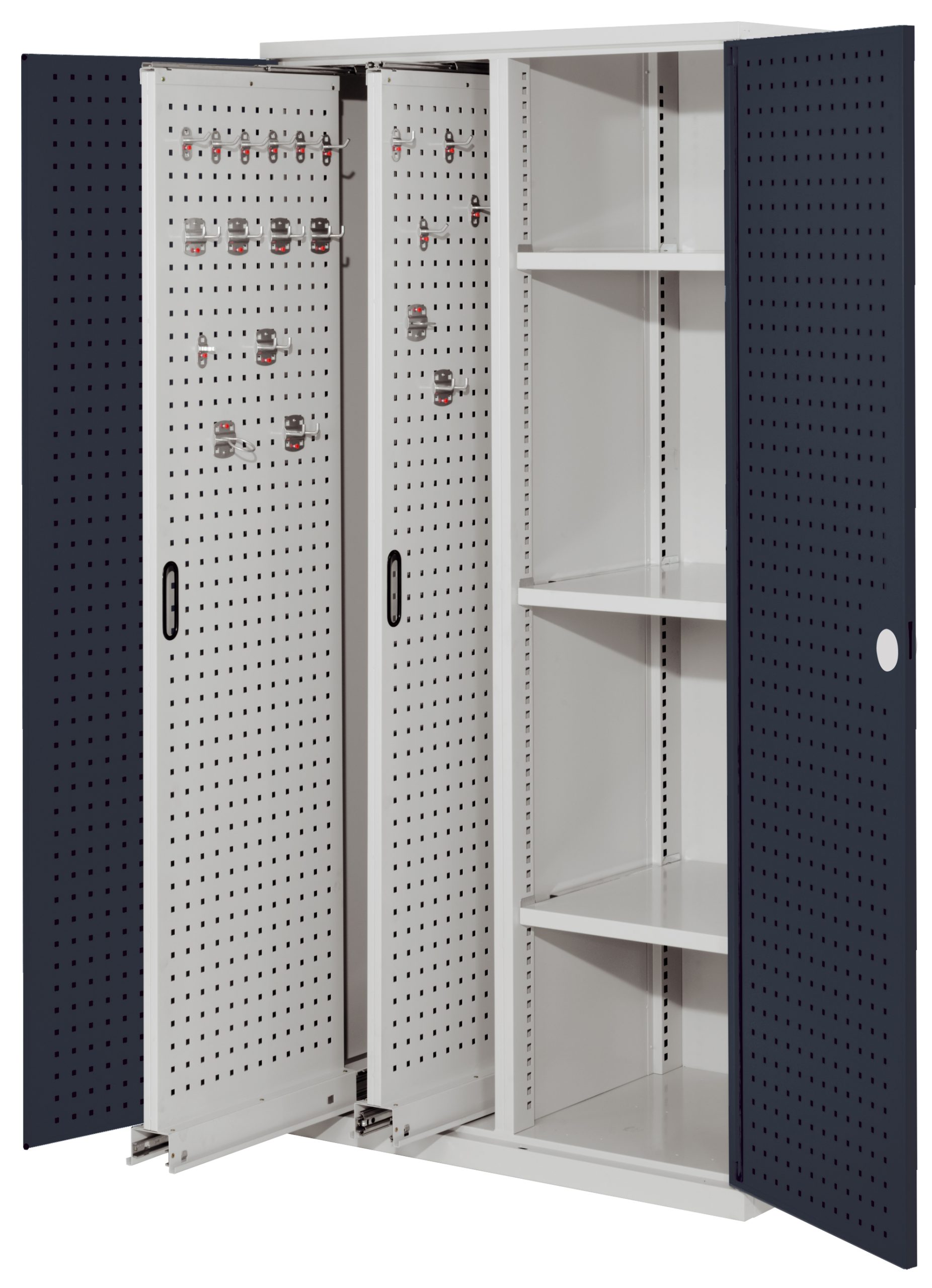 ®RasterPlan kasten, met perfodeuren. Uitgevoerd inclusief twee uittrekbare perfopanelen en drie legborden.