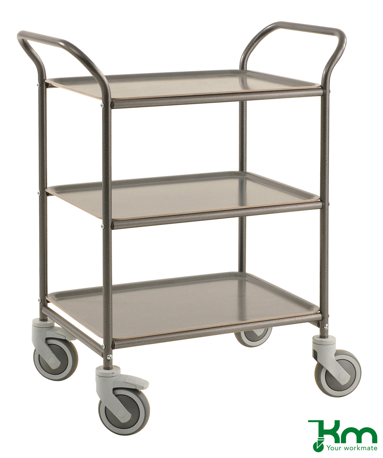 Serveerwagens zijn leverbaar in poedercoating wit, blauw of antraciet grijs. De serveerwagens worden geleverd met 3 uitneembare dienbladen met antislip oppervlak. Afmeting van de dienbladen 600 x 450 mm. De wagens zijn uitgevoerd met 4 grijze rubberband zwenkwielen waarvan 2 met rem, Ø125 mm. Draagvermogen 150 kg. Levering serveerwagen ongemonteerd.