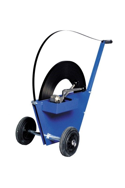 Staalbandwagen voor staalbandrollen met breedte 10-19 mm. Eenvoudig en snel wisselen van staalbandrollen. Voorzien van bakje voor opslag van gereedschappen en toebehoren. Voorzien van wielen met massieve rubberband ®200 mm