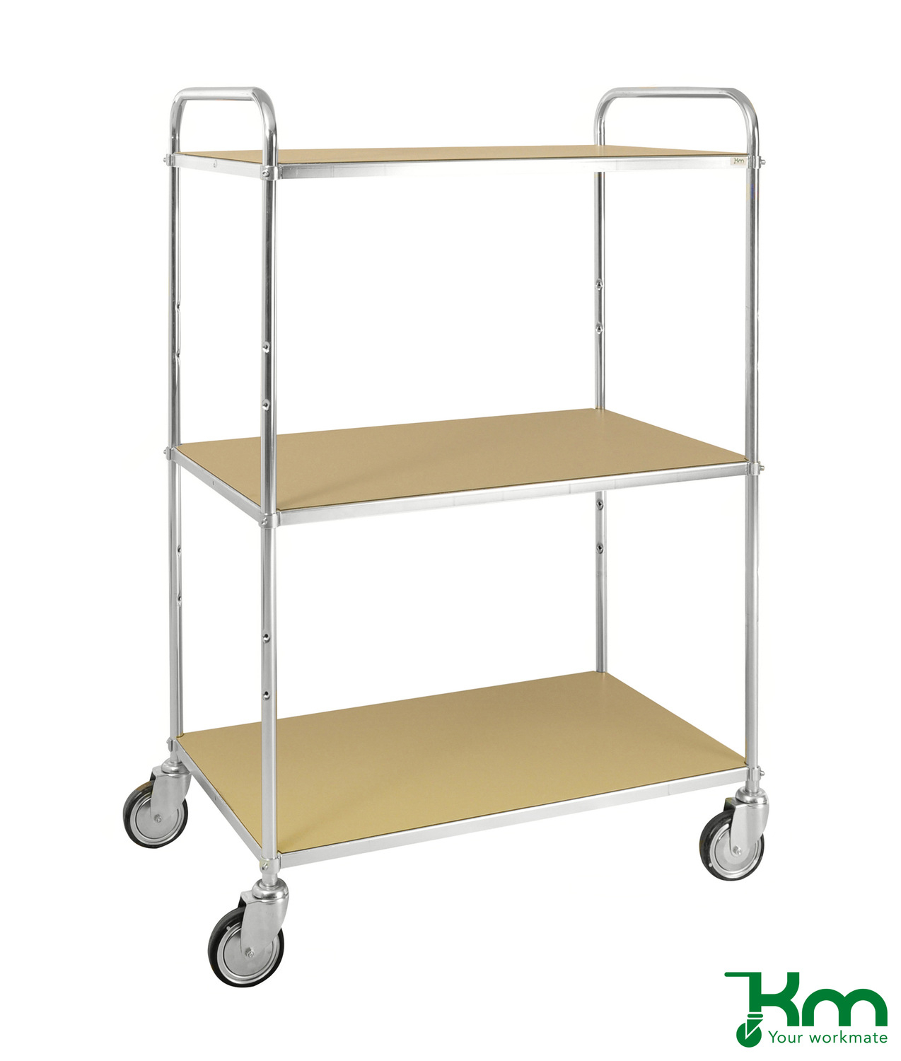 Etagewagen in elektrolytisch verzinkte uitvoering. De wagen wordt geleverd met 3 ESD legborden. De nuttige ruimte tussen de legborden bedraagt 530 mm. De etagewagen is uitgevoerd met 4 grijze ESD rubberband zwenkwielen zonder rem, Ø125 mm. Levering ESD etagewagen ongemonteerd.