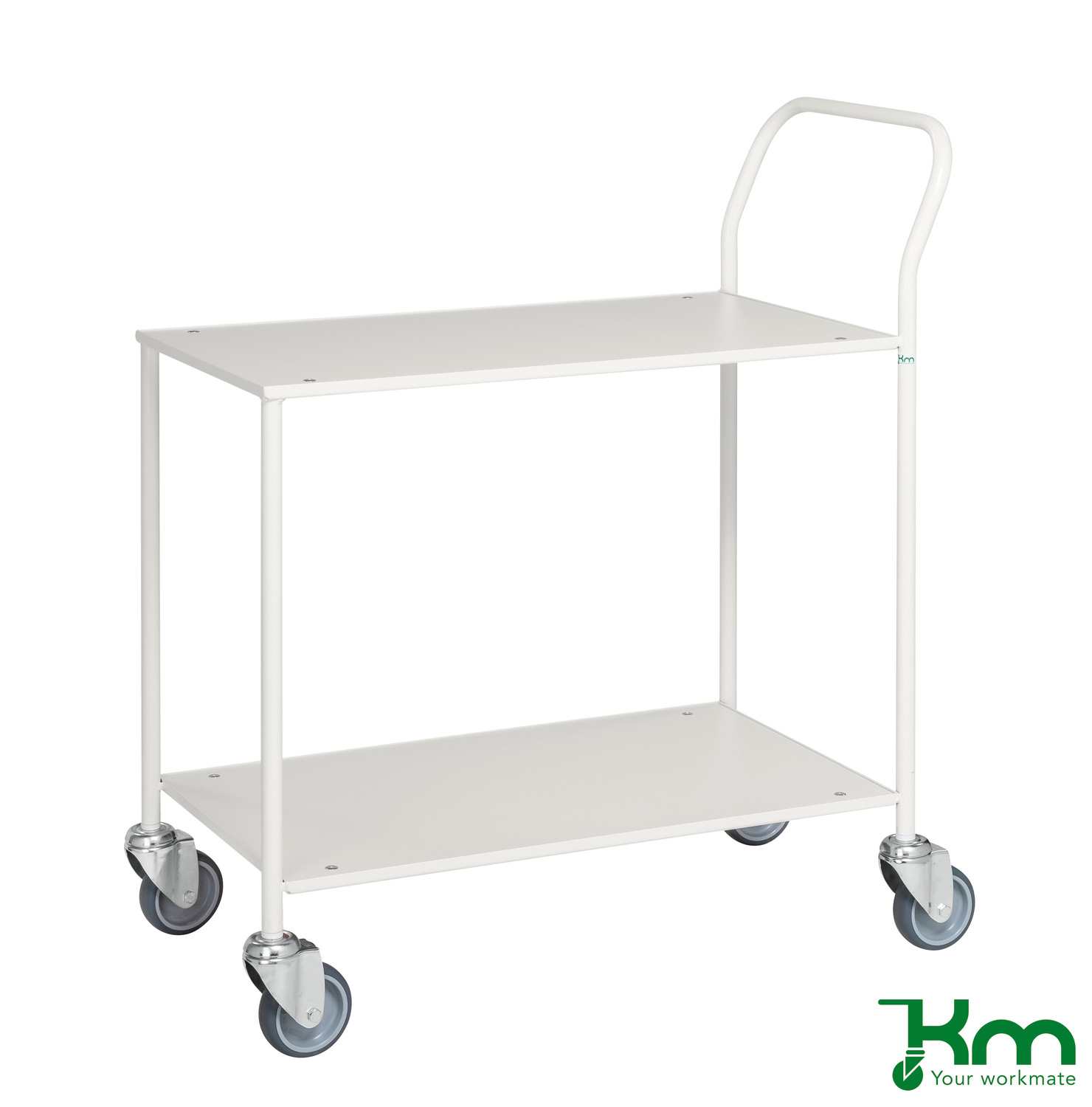 Tafelwagen in witte poedercoating. De wagen wordt geleverd met 2, 10 mm dikke legborden die voorzien zijn van een gelamineerde toplaag in de kleur wit. De nuttige ruimte tussen de legborden bedraagt 510 mm. De tafelwagen is uitgevoerd met 4 grijze rubberband zwenkwielen zonder rem, Ø100 mm.