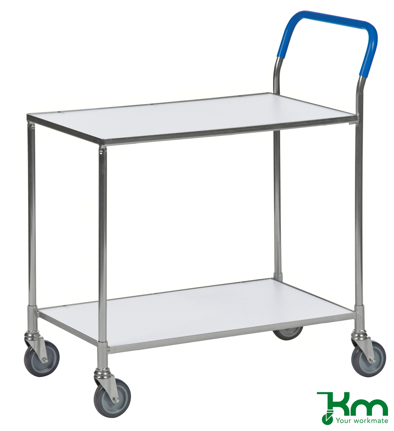 De tafelwagens zijn leverbaar in poedercoating blauw, wit of in elektrolytisch verzinkte uitvoering. De tafelwagens worden geleverd met 2, 10 mm dikke legborden die voorzien zijn van een gelamineerde toplaag in de kleuren rood, wit, beuken- of berkenstructuur. De duwbeugels worden voorzien van een geplastificeerde handgreep. De tafelwagens zijn uitgevoerd met 4 grijze rubberband zwenkwielen zonder rem, Ø100 mm. Levering tafelwagen ongemonteerd.