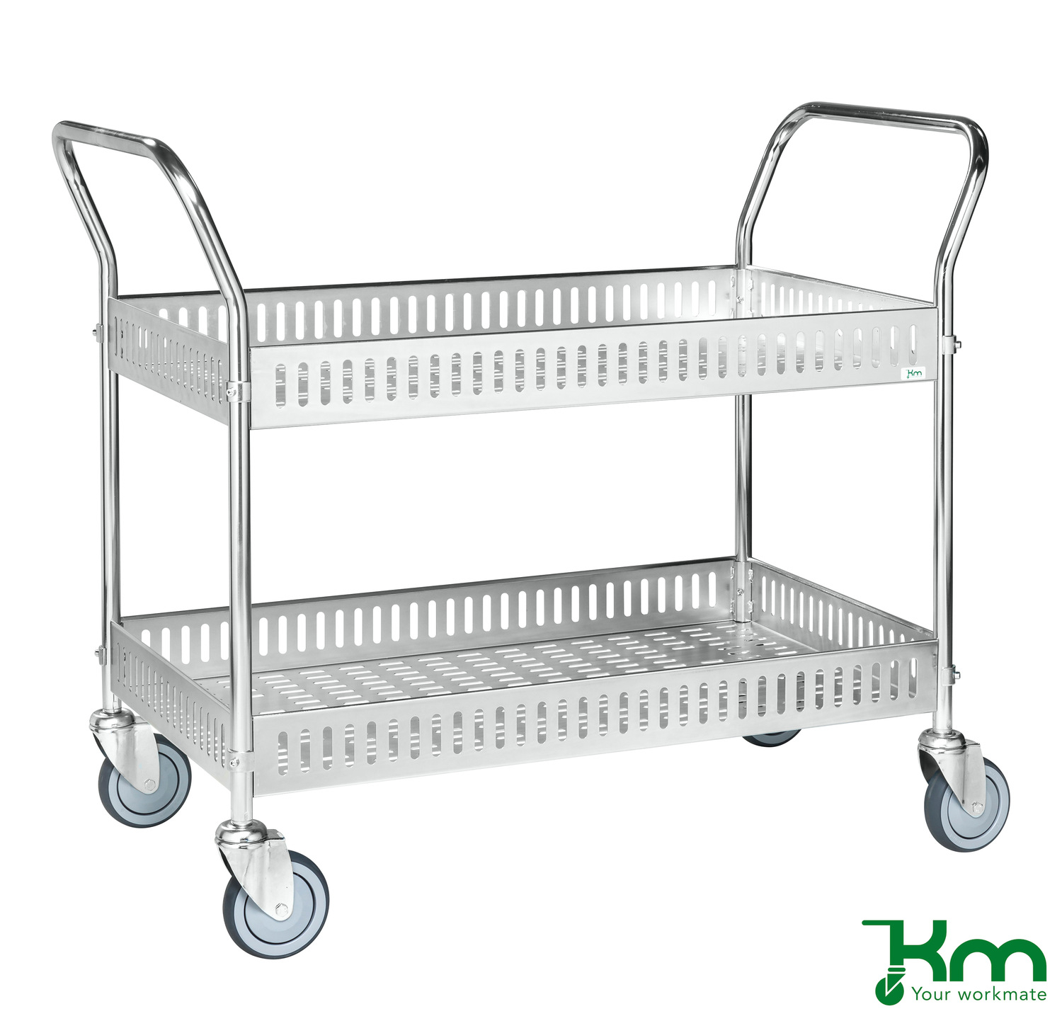 De tafelwagens zijn leverbaar in poedercoating blauw, wit, antraciet of in elektrolytisch verzinkte uitvoering. De tafelwagens worden geleverd met 2 legborden voorzien van omranding H=90 mm. De tafelwagens zijn uitgevoerd met 4 zwarte rubberband zwenkwielen zonder rem, Ø125 mm. Levering tafelwagen ongemonteerd.