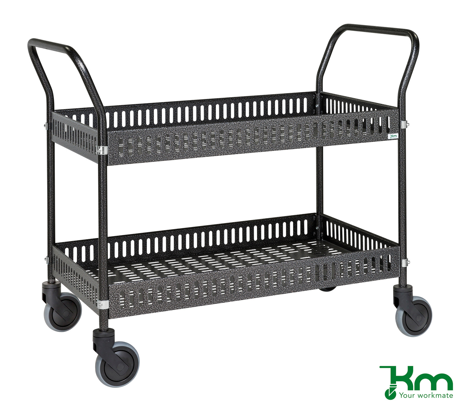 De tafelwagens zijn leverbaar in poedercoating blauw, wit, antraciet of in elektrolytisch verzinkte uitvoering. De tafelwagens worden geleverd met 2 legborden voorzien van omranding H=90 mm. De tafelwagens zijn uitgevoerd met 4 zwarte rubberband zwenkwielen met rem, Ø125 mm. Levering tafelwagen ongemonteerd.