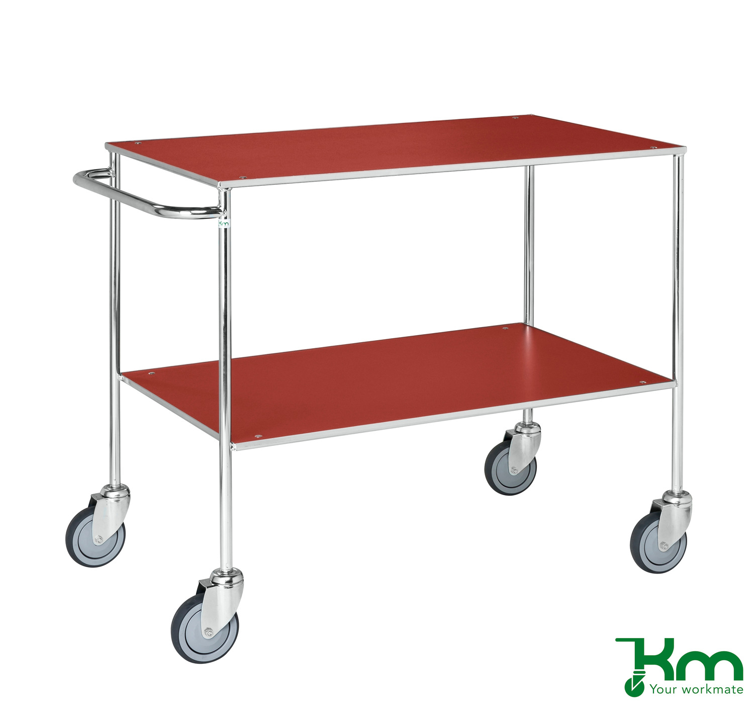Tafelwagen 1000x580x850 mm (LxBxH) in electrolytisch vezinkte uitvoering. Legborden voorzien van rode toplaag. Draagvermogen 150 kg. Uitgevoerd met 4 zwenkwielen met grijze rubberband diameter 125 mm