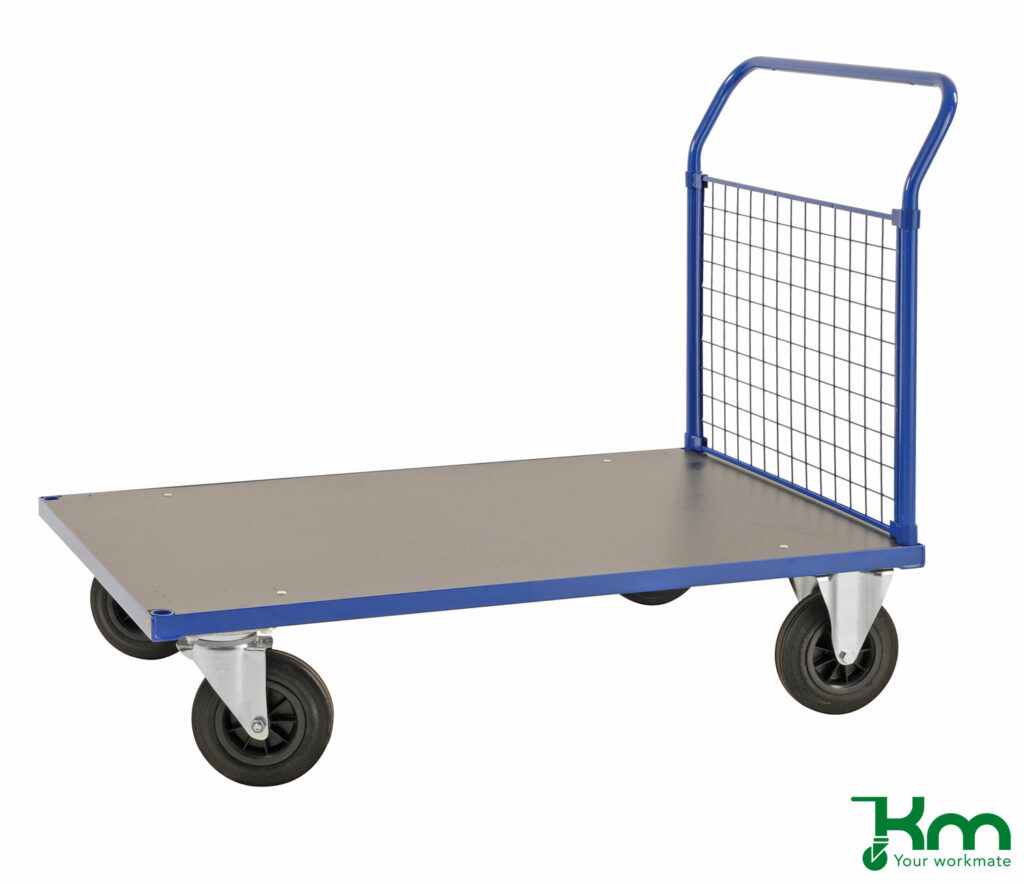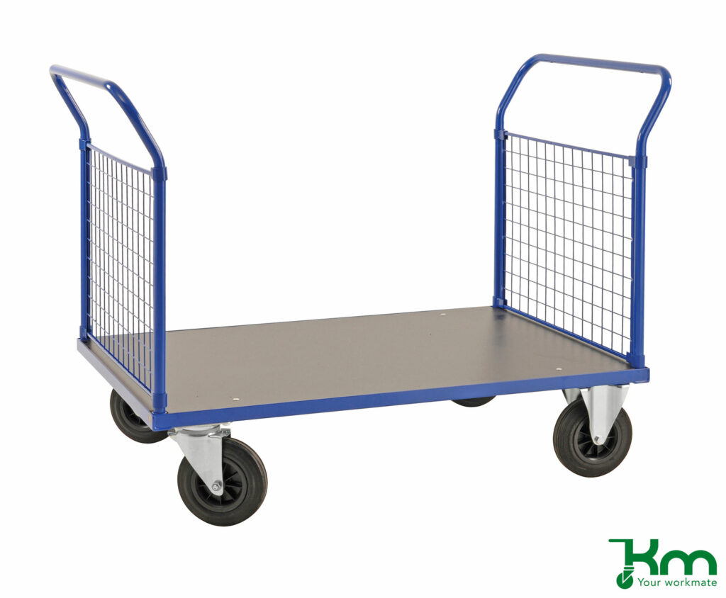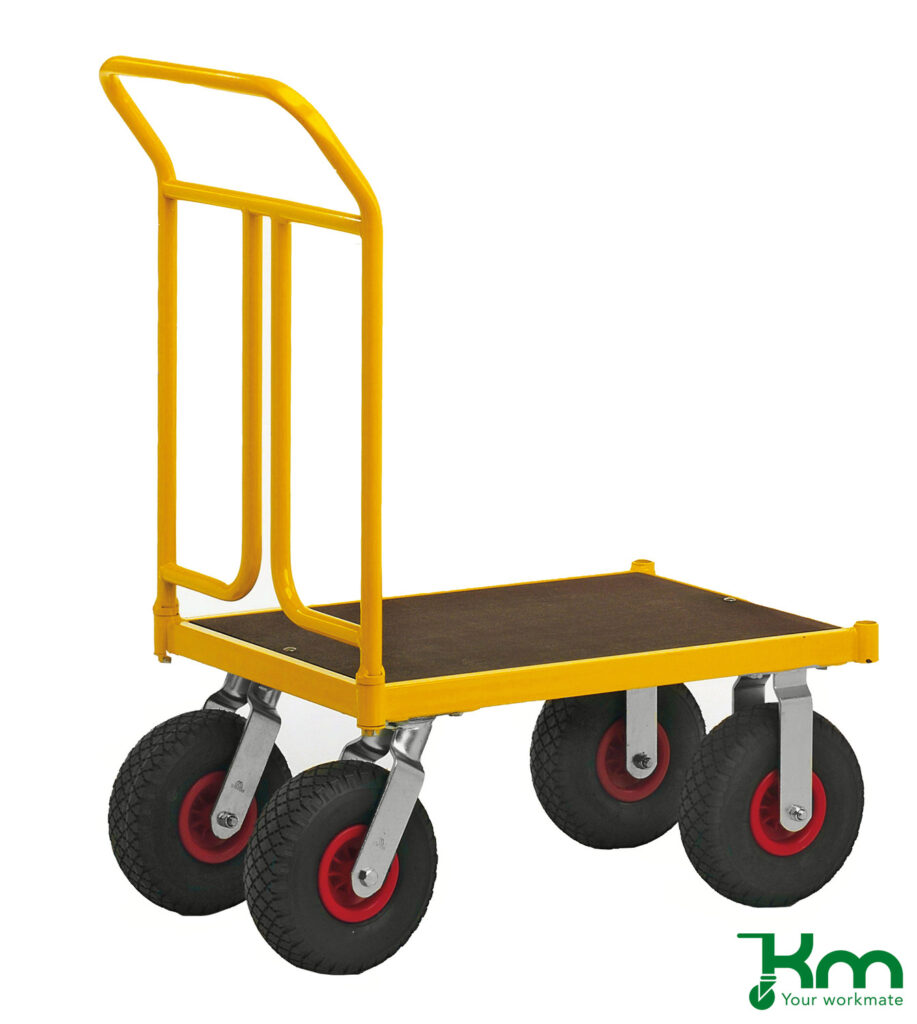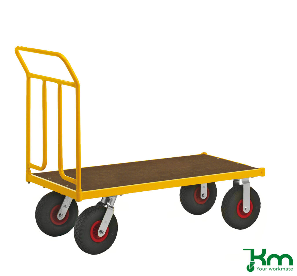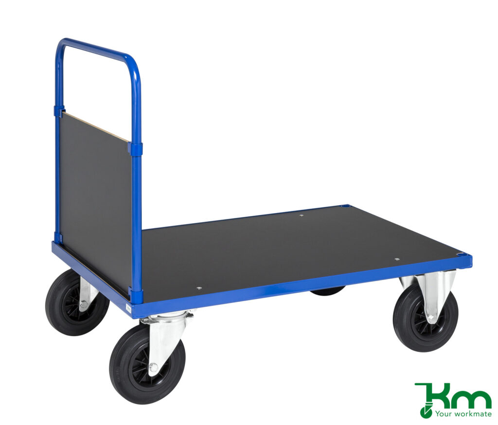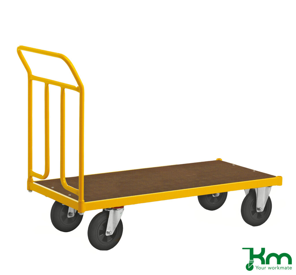Een duwwagen is een praktische platte transportkar met een stevige duwbeugel, ontworpen voor het efficiënt vervoeren van diverse goederen. Dankzij de ergonomische werkhoogte kunnen producten met minimale inspanning worden verplaatst.
