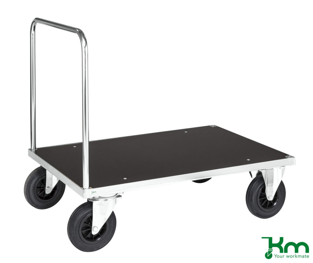 Een duwwagen is een praktische platte transportkar met een stevige duwbeugel, ontworpen voor het efficiënt vervoeren van diverse goederen. Dankzij de ergonomische werkhoogte kunnen producten met minimale inspanning worden verplaatst.