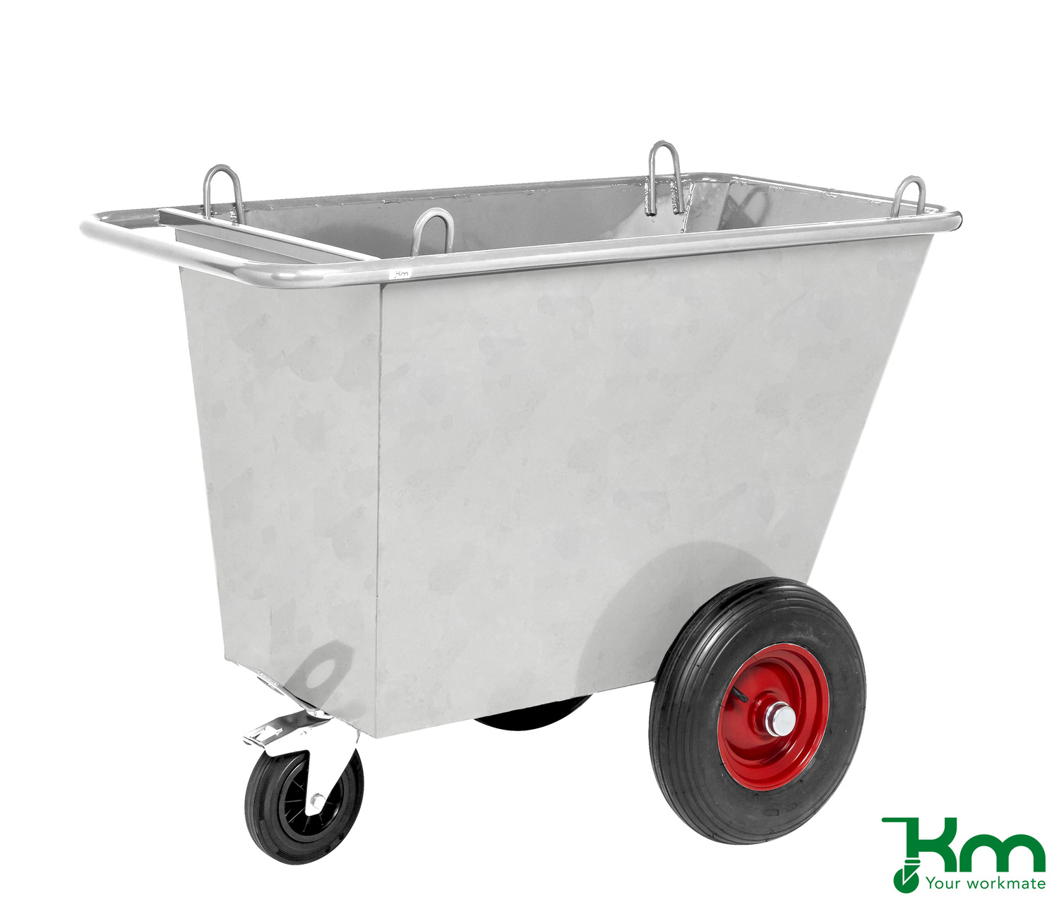 KM verrijdbare afvalbak voorzien van 4 hijsogen. De afvalbakken zijn leverbaar in poedercoating rood en in elektrolytisch verzinkte uitvoering. De KM verrijdbare afvalbakken zijn uitgevoerd met 1 massief rubberband zwenkwiel met rem en 2 vaste luchtband wielen.