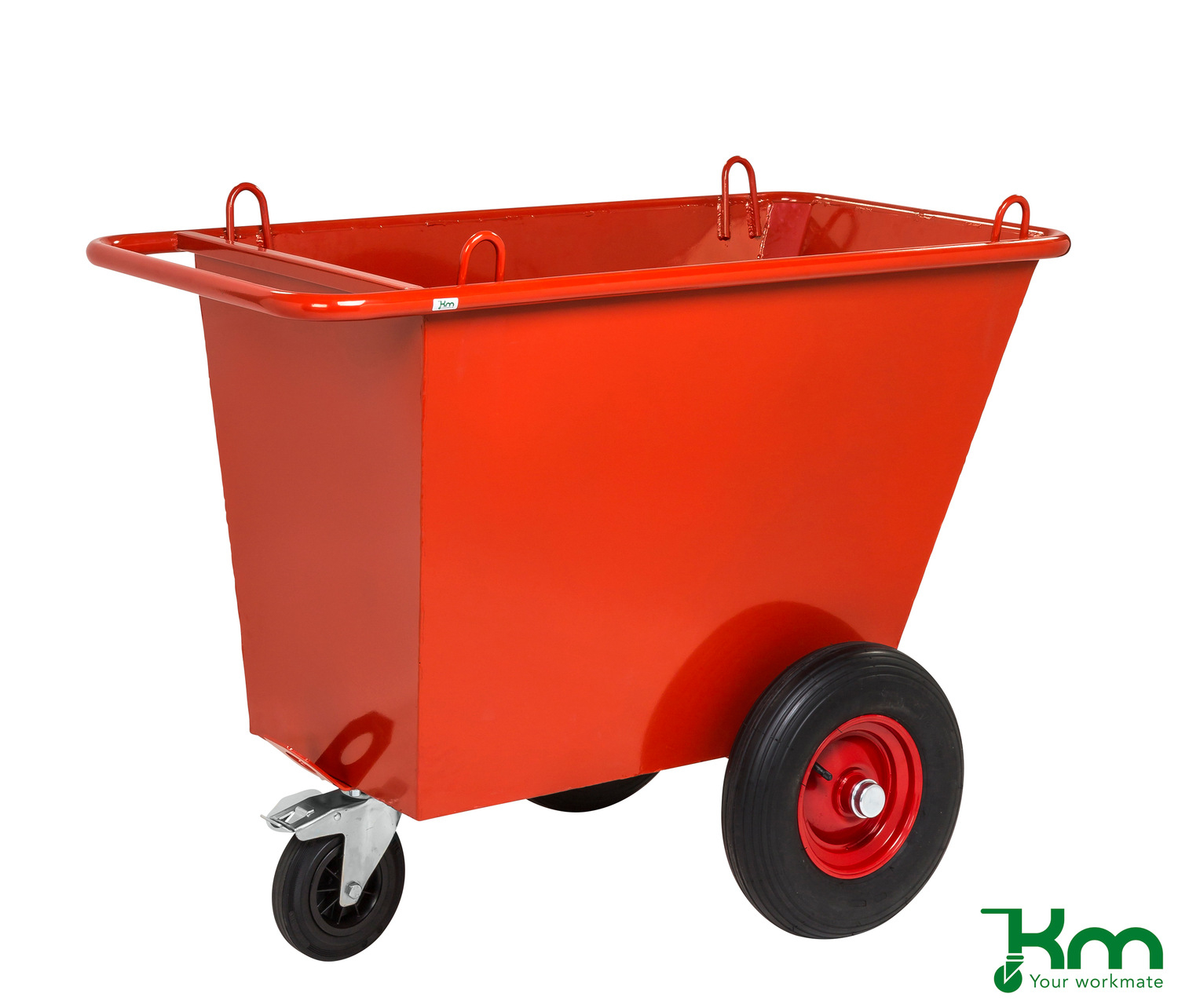 KM verrijdbare afvalbak voorzien van 4 hijsogen. De afvalbakken zijn leverbaar in poedercoating rood en in elektrolytisch verzinkte uitvoering. De KM verrijdbare afvalbakken zijn uitgevoerd met 1 massief rubberband zwenkwiel met rem en 2 anti-lek wielen.