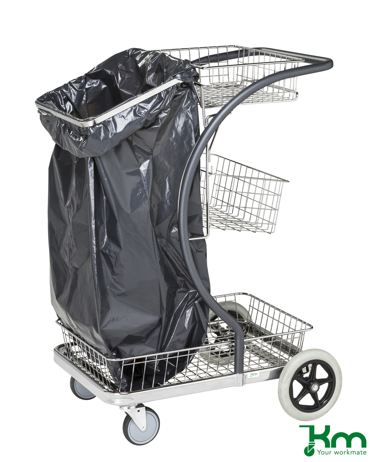 KM verrijdbare schoonmaakwagen op 2 zwenkwielen en 2 vaste wielen. De schoonmaakwagen is leverbaar in kleur grijs. Geschikt voor een 100 L plastic zak. Levering schoonmaakwagen ongemonteerd.