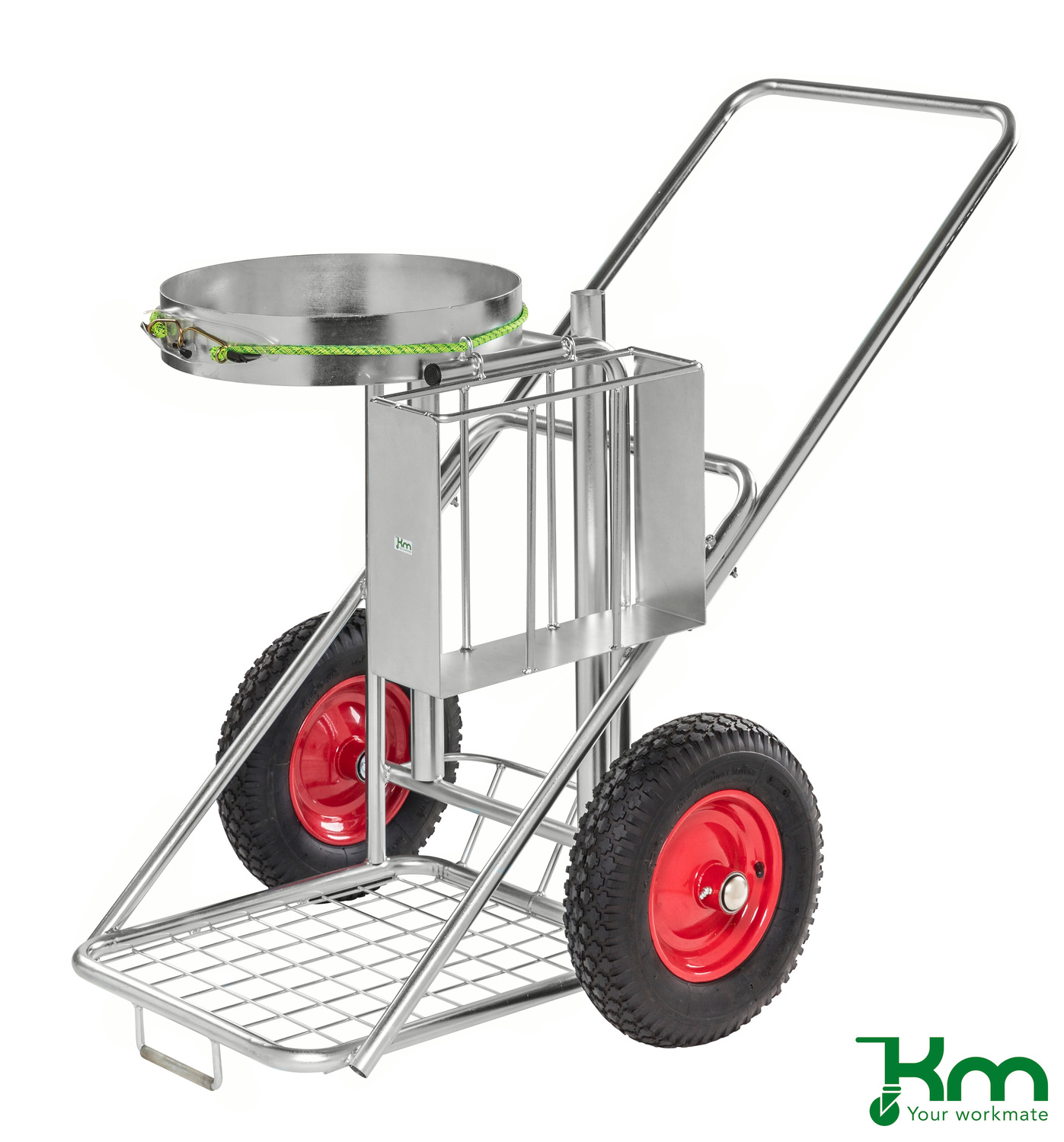 KM verrijdbare schoonmaakwagen op anti-lek wielen. De schoonmaakwagens zijn leverbaar in elektrolytisch verzinkte uitvoering of in poedercoating geel. Voorzien van een rubberen ring om de plastic zak op zijn plaats te houden, bezemhouder en opbergrek voor schoonmaakattributen.