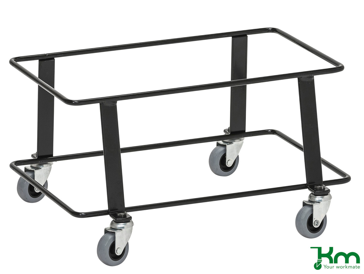 Dolly voor winkelmanden in zwarte uitvoering. De dolly’s zijn uitgevoerd met 4 grijze rubberband zwenkwielen zonder rem, Ø50 mm. Draagvermogen 50 kg. Levering zonder winkelmanden.